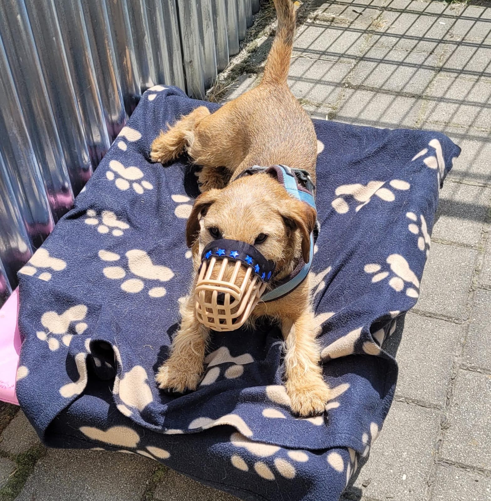 Rowdy wurde an den Maulkorb gewöhnt und trägt diesen dauerhaft im Sozialkontakt mit Menschen. Damit kommt er aber sehr gut klar.